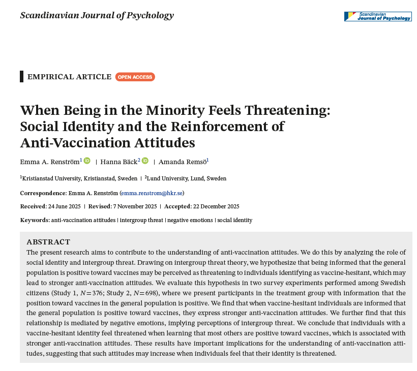 In a new article published in Scandinavian Journal Of Psychology, we tested if intergroup threat leads vaccine-skeptic individuals to reinforce their attitudinal position in two experiments. We find that such threats do increase anti-vaccination attitudes. The article is open access here.